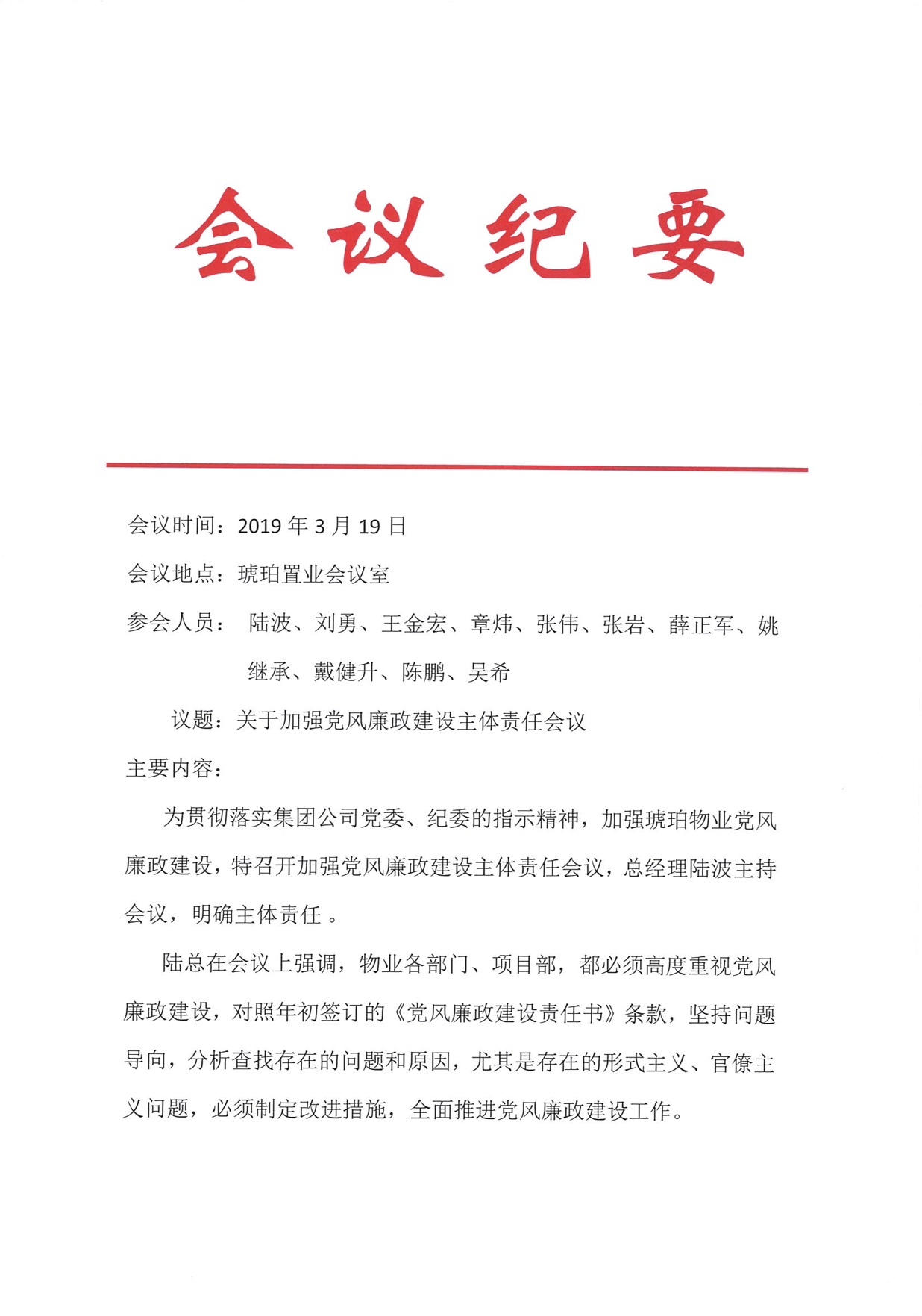 琥珀物業(yè)于2019年初,針對公司黨風廉政建設主體責任落實召開專題會議,按照集團公司下發(fā)的黨風廉政責任書的部署和要求組織、分解黨風廉政建設任務,貫徹落實“三重一大”事項集體決策制度。