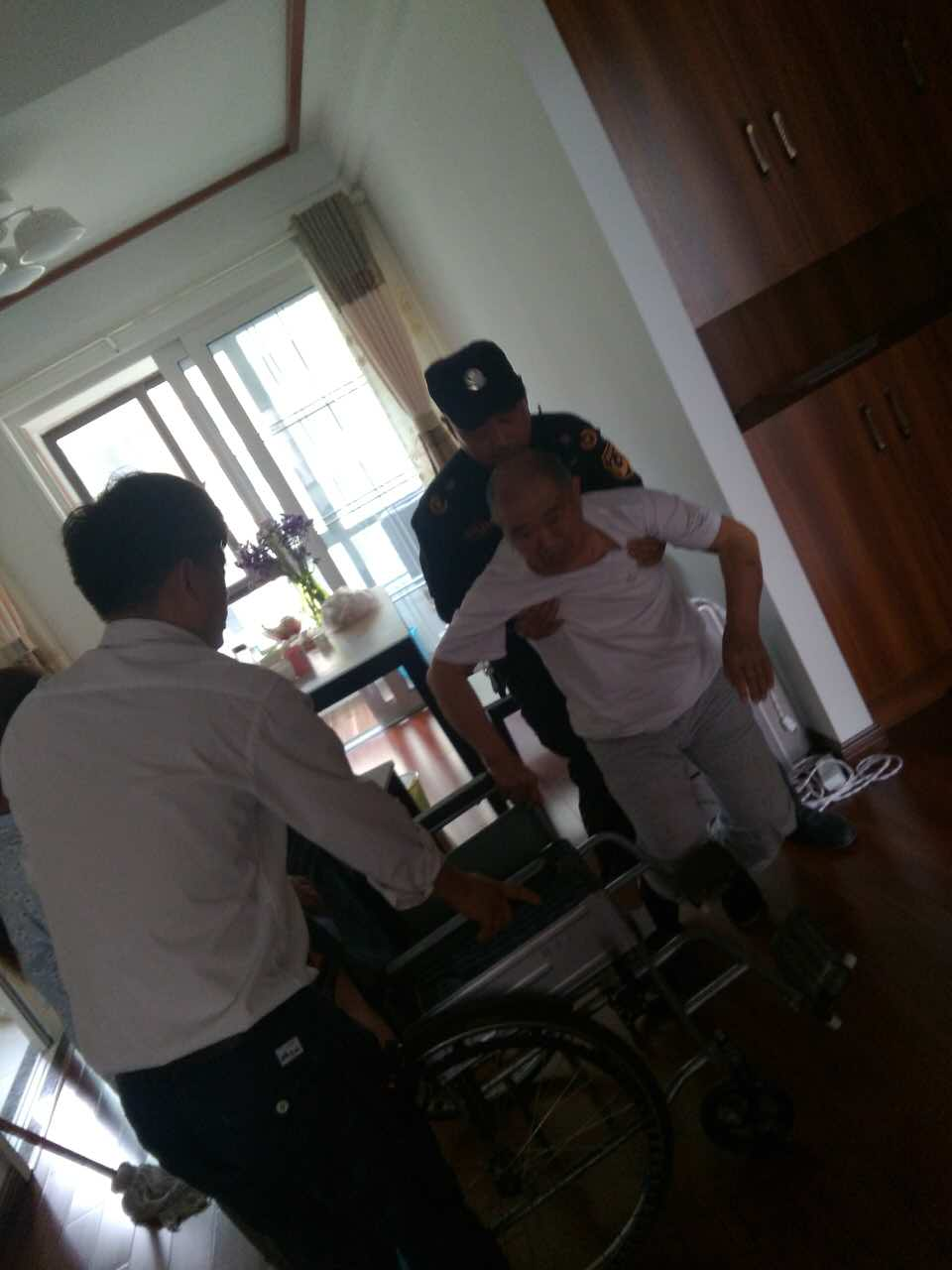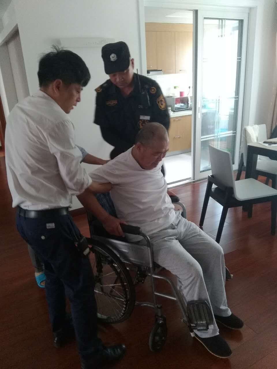 (業(yè)主家老人不小心摔倒,物業(yè)人員上門幫忙攙扶)